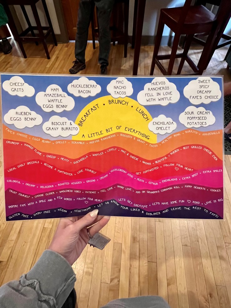 This restaurant in Livingston immediately caught my eye when I saw it online. It is called Faye’s Café and has raving reviews online. Five stars on yelp, 4.7 on google, it’s on many “best of” list’s as written by bloggers, and when reviewing the menu, I am very intrigued. This is not your typical menu. The chef Sarah Faye has implemented a different kind of cooking called, Yumtwist. Yumtwist is the art of spontaneity in the kitchen. The menu is built with words on a colorful laminated sheet, and all you have to do is choose a few words or tell the server what you like or are craving, and she comes up with a dish made specifically for you.